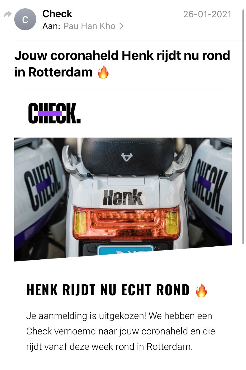 Een Rotterdams leenscooterbedrijf (Check.) heeft een actie bedacht ( Coronahelden) waarbij ze de scooters namen geven van personen die een inspiratie zijn van positiviteit tijdens de lockdown! Henk ten Bos is ook gekozen hiervoor.